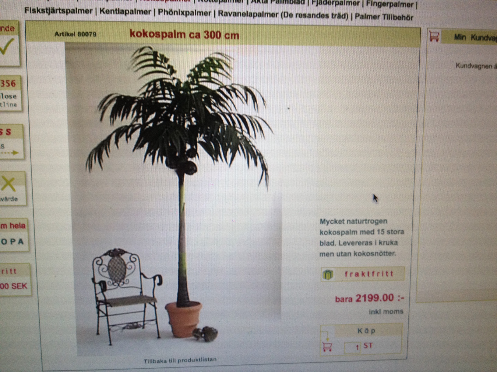 Ja här tog egentligen inlägget slut, men min nyfikenhet över dessa plastträd fick mig att googla lite. Här: ett praktexemplar! ”300 cm, mycket naturtrogen kokospalm med 15 stora blad. Levereras i kruka men utan kokosnötter. Fraktfritt, bara 2199 kronor inkl. moms.”