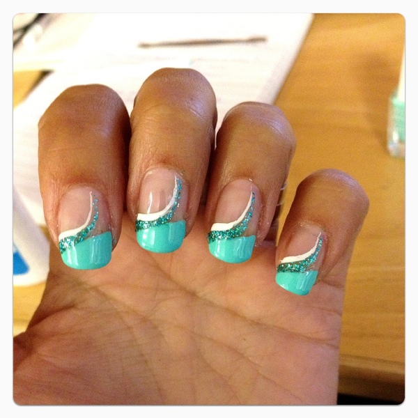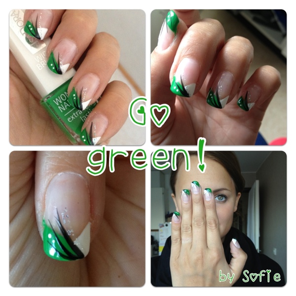 Färgerna kommer från Isadora och heter Go Green och Plain White. De smala svarta linjerna har jag målat med Depends art line-lack (jättesmal pensel) och glittret kommer från ebay.
