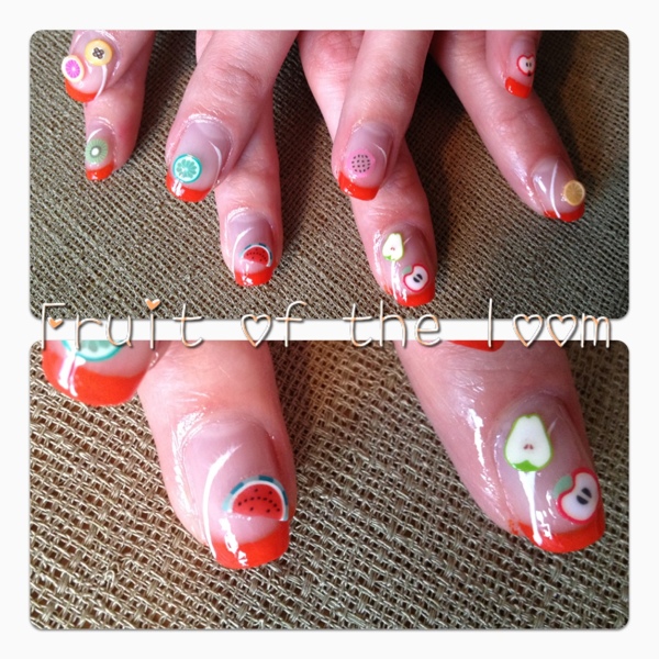 NaglarEn bild jag visat tidigare i förbifarten. Jennifer är dietist och ville ha lite roliga naglar, här är hennes ”fem frukter om dagen-naglar”! Tipparna är målade i Isadoras Bird of paradise, linjerna med Depends art line-lack och frukterna kommer från Ebay.