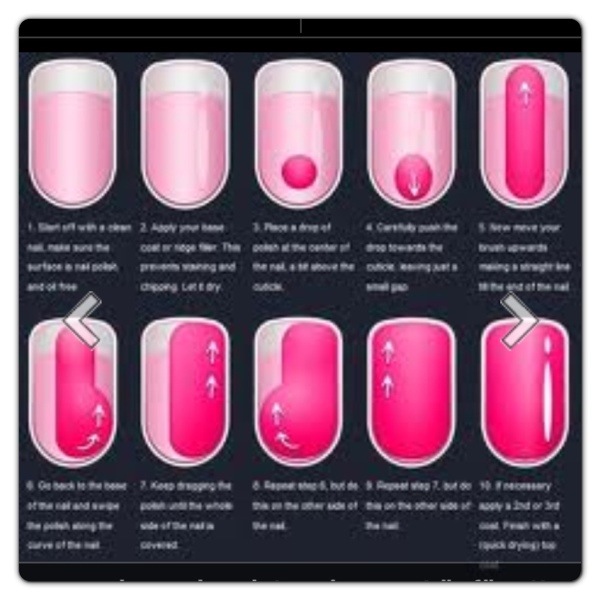 Hittade en mycket illustrativ bild över hur man enklast och bäst målar en nagel. Tyvärr syns inte texten, men jag tycker att bilden talar för sig själv. De två första stegen är underlacket, sedan är det bara köra!