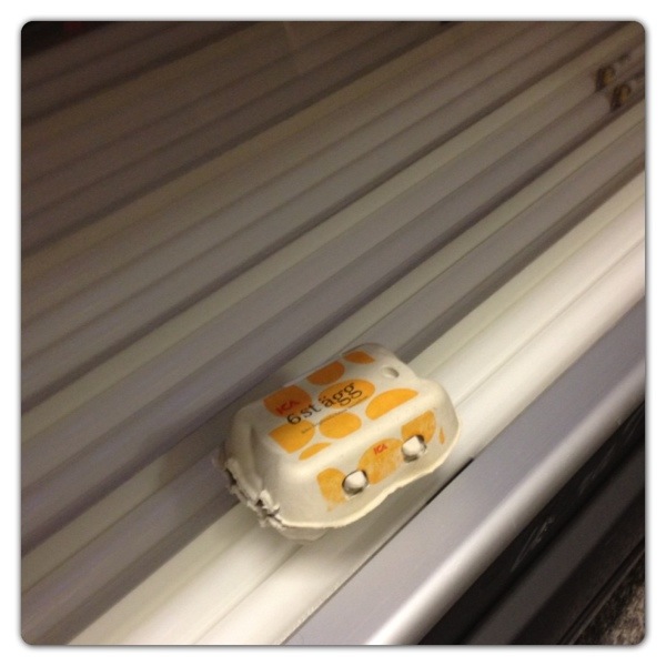 Nåväl, det blev i alla fall en blixtvisit till Arvidsjaur igår med ett par vänner. Hittade en ny tröja, handlade öl inför helgen och solade solarium. Men döm om min förvåning när jag öppnade solariet och fann ett paket ägg! Jag vill kanske egentligen inte veta vad som försiggåtts i det solariet före mig, men lite nyfiken måste man ändå vara. :)