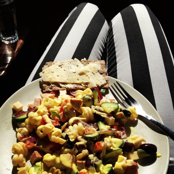 Ord fångade i bildPastasallad med currydressing. Sol. Ett glas vatten. Randiga byxor. Balkong. Sällskap. Husmans. Mer än så behövs inte för den perfekta sommarlunchen. Tänk att det finns folk som av olika anledningar inte gillar sommaren, det är nu jag trivs som allra bäst!