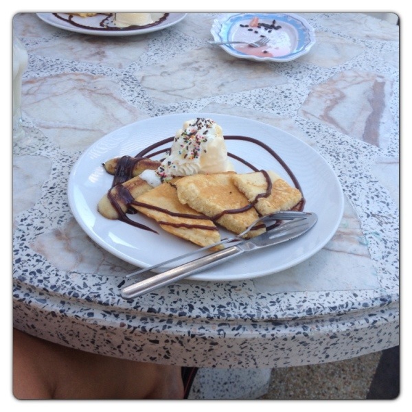Dagen på stranden avrundade jag och Lotta med det mastigaste mellanmålet på länge. Det blev pannkakor med glass och stekta bananer, och en milkshake. Är det semester så är det. :) Börjar dock längta efter att röra på mig igen, så det blir nog en del gym för mig framöver. Känns bra! Men först ska jag avsluta min drink. Och middagen ikväll. Och fruktdrinken på stranden i morgon. Och.. Haha. Ja, ni fattar.
